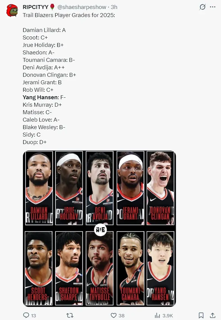 開(kāi)拓者媒體Ripcityy為開(kāi)拓者眾將的2025年進(jìn)行了評分:(是最差的那個(gè))